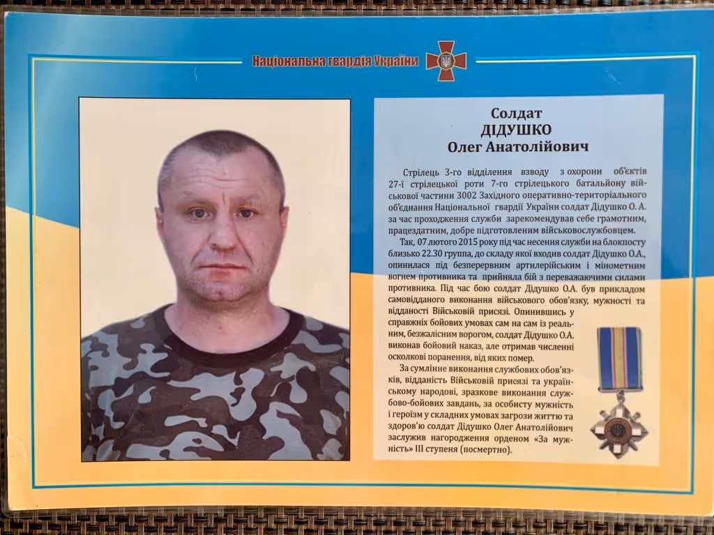 On February 7, 2015, at about 22:30 during service at a checkpoint near the city of Debaltseve (Donetsk region), the group, which included soldier Oleg Didushko, came under continuous artillery and mortar fire and took the battle with the overwhelming forces of the enemy. During the battle, Oleg Didushko received numerous shrapnel injuries incompatible with life.